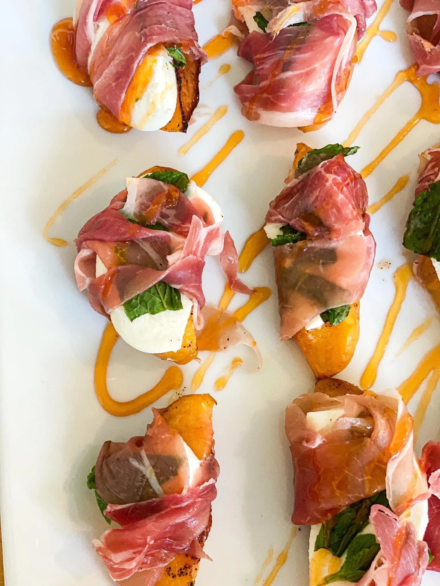 Herbed Whipped Feta Crostini: Whipped feta with roasted cherry tomatoes, prosciutto, fresh basil, and a hot honey drizzle for spice and sweetness.